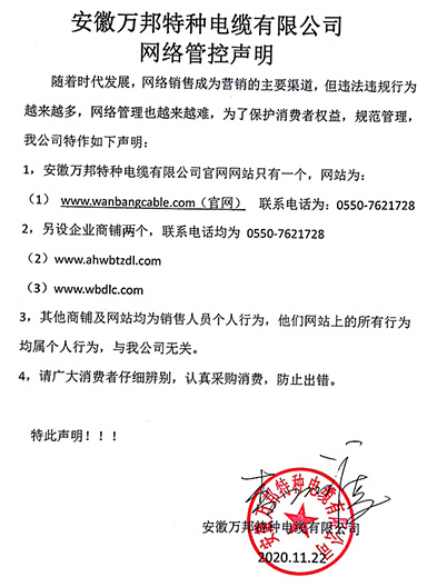鄭重聲明:安徽萬邦特種電纜有限公司官方網站為:www_wanbangcable_com.of361.com,除此之外無任何子網站或合作網站,其余均為假冒偽劣。電話:0550-7621728 13485756353 地 址:安徽省天長市滁州高新技術產業開發區經四路29號